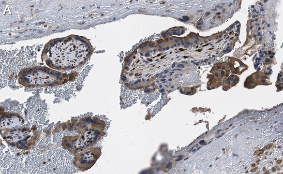 Immunohistochemistry (Paraffin) Analysis: A 1:100 dilution from a representative lot detected DAP Kinase1 in human placenta tissue sections.