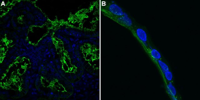 Immunofluorescence Analysis: A 1:500 dilution from a representative lot detected Aquaporin 5 in human small intestine tissue and duodenum intestinal organoid sections.