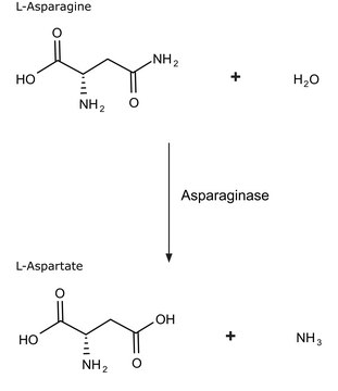 门冬酰胺酶可能通过将必需的左旋门冬酰胺转化为门冬氨酸和氨而导致白血病细胞死亡 。天冬酰胺酶是变构调节酶,对正常细胞功能至关重要。