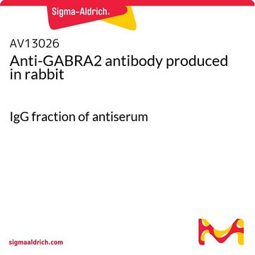 Rabbit polyclonal anti-GABRA2 antibody is used to tag Gamma-Aminobutyric acid (GABA) A receptor, α-2 for detection and quantitation by immunocytochemical and immunohistochemical (IHC) techniques. It is used as a probe to determine the presence and roles of Gamma-Aminobutyric acid (GABA) A receptor, α-2 in alcohol dependency/alcoholism. Anti-GABRA2 antibody produced in rabbit is suitable for western blotting at a concentration of 1.25 μg/ml.
