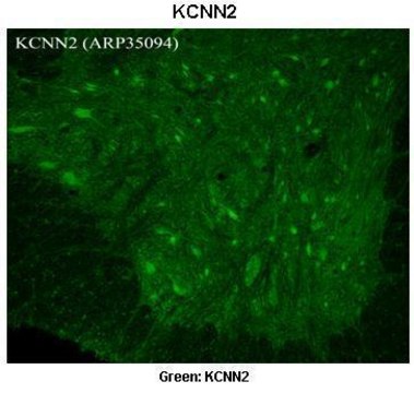 Rabbit Anti-KCNN2 antibody recognizes human, mouse, rat, bovine, pig, chicken, canine, and zebrafish KCNN2.