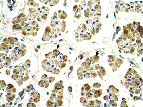 Anti-POR (AB1) polyclonal antibody is used to tag P450 (cytochrome) oxidoreductase for detection and quantitation by Western blotting and in plasma by immunohistochemical (IHC) techniques. It is used as a probe to determine the roles of P450 (cytochrome) oxidoreductase in metabolic processes that depend upon electron transfer to P450 enzymes, heme oxygenases, cytochrom b5 and squalene monooxygenases.