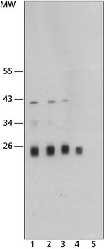 The antibody recognizes the native and denaturated forms of the protein and does not cross react with human cathepsin V. Monoclonal Anti-Cathepsin L specifically recognizes human cathepsin L (∼ 25 kDa) and procathepsin L (∼ 42 kDa). Anti-Cathepsin L antibody epitope resides within amino acids of human cathepsin L (FYKE).