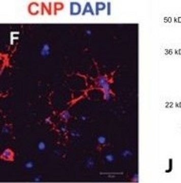 该抗体可与少突胶质细胞和Schwann细胞中的CNPase发生特异性反应。可识别全脑CNPase。神经细胞、轴突和星形胶质细胞似乎没有被标记。通过使用免疫印迹技术,抗体可对酶的CNP1和CNP2条带进行定位。