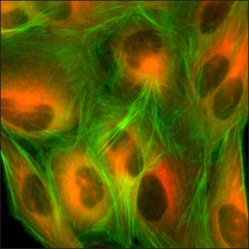 This product is a human U2OS cell line in which the genomic ACTB gene has been endogenously tagged with a Green Fluorescent Protein (GFP) gene and in which the genomic TUBA1B gene has been endogenously tagged with a Red Fluorescent Protein (RFP) gene using CompoZr® Zinc Finger Nuclease technology. Integration resulted in endogenous expression of a fusion protein in which GFP is attached to the N-terminus of actin and of a fusion protein in which RFP is attached to the N-terminus of tubulin. Fluorescence imaging shows that the actin can polymerize to form the characteristic pattern of actin filaments and that the tubulin can polymerize to form the characteristic pattern of microtubules. This stable cell line was expanded from a single clone. The target′s gene regulation and corresponding protein function are preserved in contrast to cell lines with overexpression via an exogenous promoter.