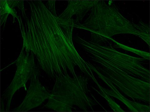 Actin–FITC antibody is suitable for direct immunofluorescence at a dilution of 1:75, using cultured human or chicken fibroblasts.