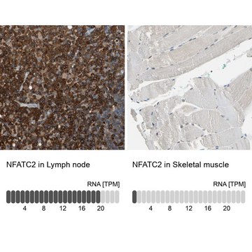 Anti-NFATC2 antibody produced in rabbit, a Prestige Antibody, is developed and validated by the Human Protein Atlas (HPA) project . Each antibody is tested by immunohistochemistry against hundreds of normal and disease tissues. These images can be viewed on the Human Protein Atlas (HPA) site by clicking on the Image Gallery link. The antibodies are also tested using immunofluorescence and western blotting. To view these protocols and other useful information about Prestige Antibodies and the HPA, visit sigma.com/prestige.