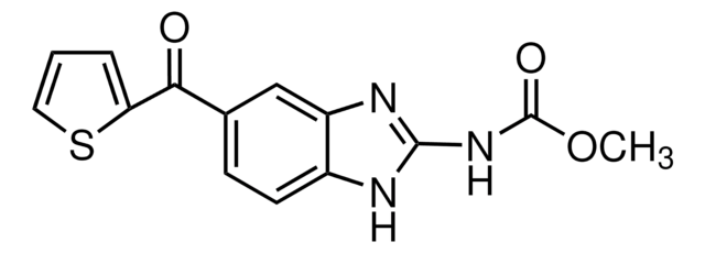 诺考达唑(Nocodazole)是一种抗有丝分裂剂,通过结合β−−微管蛋白,阻止两对链间二硫键之一的形成,进而抑制微管动力学、破坏有丝分裂纺锤体功能和片段化高尔基复合体来解聚微管。诺考达唑将细胞周期阻滞在G2/M期,也阻止T细胞抗原受体的磷酸化并抑制其活性。在一些正常和肿瘤细胞系中,诺考达唑刺激微管蛋白内在GTP酶活性,激活JNK/SAPK信号传导通路和诱导凋亡。诺考达唑增强CRISPR同源重组修复(HDR)效率和加强Cas9介导的编辑频率。
