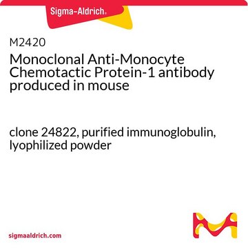 Monocyte Chemotactic Protein-1 (MCP-1) is a chemotactic factor that belongs to CC chemokine family and can attract basophils and monocytes but not eosinophils or neutrophils. It is produced in keratinocytes, fibroblasts, hepatoma cells and Type II pneumocytes in response to IL-1. It has a crucial role in recruiting immune cells to the site of antigens as well as behaves as an inflammatory mediator which stimulates the directional migration of T cells and monocytes. Monoclonal anti-Monocyte Chemotactic Protein-1 antibody is suitable for neutralization, in which it will not neutralize the activity of recombinant human MIP-1α, recombinant mouse MIP-1α or recombinant human RANTES. Mouse anti-Monocyte Chemotactic Protein-1 antibody reacts specifically with human MCP-1/CCL2.
