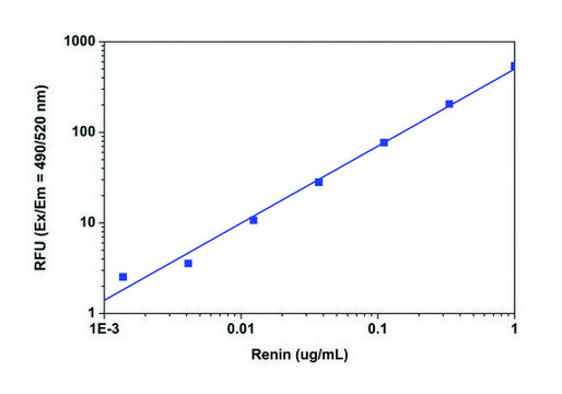 肾素的活性是通过含有荧光猝灭剂的专有荧光共振能量转移(FRET)肽测定的。肾素切割肽会产生一种荧光产物(λex = 540/λem = 590 nm)。该测定的灵敏度约是基于 EDANS/DABCYL 的测定的 50 倍。