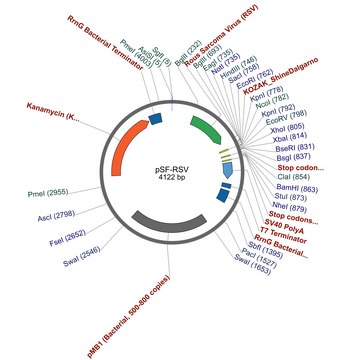 Cloning in a gene: PSF-RSV - RSV promoter plasmid has been designed to be compatible with a range of cloning techniques. The multiple cloning site contains a range of standard commonly used restriction sites for cloning. Using these sites genes can be inserted using standard cloning methods with DNA ligase. Other methods such as ligase independent cloning (LIC) Gibson Assembly InFusionHD or Seamless GeneArt can also be used and because all of our plasmids are based on the same backbone the same method can be used for cloning into all of our catalogue vectors.