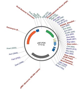 PSF-PGK - PHOSPHOGLYCERATE KINASE PROMOTER PLASMID contains the PGK (murine) promoter upstream of the multiple cloning site (MCS) for expression in mammalian cells. Transcription termination is mediated by the SV40 poly-adenylation signals downstream of the MCS.
