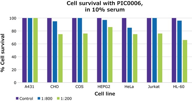 This product is a mixture of protease inhibitors with a broad specificity for the inhibition of serine, cysteine, aspartic proteases and aminopeptidases. It is designed to be used as a supplement to tissue culture medium for the prevention of secreted proteins degradation. The product has been found to be non-toxic after a 48 hours exposure to the following adherent cell lines: A431, CHO, COS, HepG2, and HeLa, and to following non-adherent cell lines: Jurkat and HL-60. This cocktail is supplied as a ready-to-use solution using a proprietary non-freezing formulation. ReadyShield PIC0006 is a non-freezing formulation that contains the same inhibitors as is the DMSO based cocktail P1860.