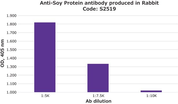 Anti-Soy Protein antibody produced in rabbit was used for soy quantification in natural rubber latex glove extracts by ELISA at 1:2000 dilution. It was used as a control in supershift analysis of growth-hormone-induced protein binding to lactogenic hormone-responsive region.
