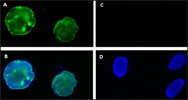 Monoclonal Anti-Progerin (mouse IgG1 isotype) is derived from the hybridoma 13A4 produced by the fusion of mouse myeloma cells and splenocytes from BALB/c mice immunized with a synthetic peptide. A-type lamins, lamin A and lamin C are products of a single gene, LMNA, which are produced by alternative splicing. Prelamin A, the precursor of Lamin A, is farnesylated at its carboxy terminus after synthesis and the last 18 amino acids, which contain the farnesyl group, are removed by the metalloprotease Zmpste24, producing the mature Lamin A. The LMNA gene codes for A-type lamin, lamin A/C.