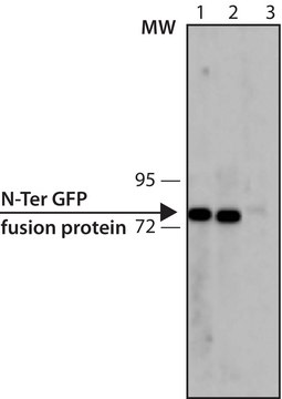单克隆抗绿色荧光蛋白(GFP)识别N末端和C末端GFP(27 kDa)标记的融合蛋白。抗体与原核表达载体表达的融合蛋白反应。