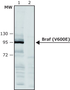 Anti-BRAF (V600E) recognizes V600E mutated human BRAF protein. The antibody may be used in various immunochemical techniques including Immunoblotting.
