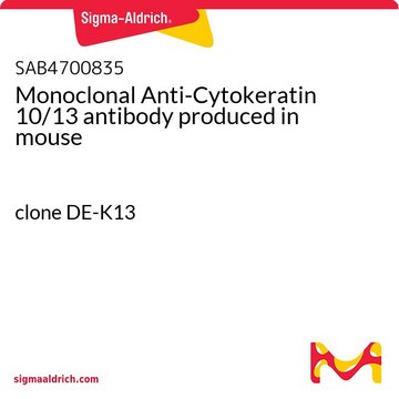 The antibody DE-K13 reacts with Cytokeratin 10 (56.5 kDa) and Cytokeratin 13 (53 kDa). Cytokeratins are a member of intermediate filaments subfamily represented in epithelial tissues. DE-K13 recognizes only Cytokeratin 13 on formalin-fixed, paraffin-embedded tissue sections.