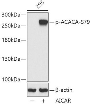Acetyl-CoA carboxylase (ACC) is a complex multifunctional enzyme system. ACC is a biotin-containing enzyme which catalyzes the carboxylation of acetyl-CoA to malonyl-CoA, the rate-limiting step in fatty acid synthesis. There are two ACC forms, alpha and beta, encoded by two different genes. ACC-alpha is highly enriched in lipogenic tissues. The enzyme is under long term control at the transcriptional and translational levels and under short term regulation by the phosphorylation/dephosphorylation of targeted serine residues and by allosteric transformation by citrate or palmitoyl-CoA. Multiple alternatively spliced transcript variants divergent in the 5′ sequence and encoding distinct isoforms have been found for this gene.