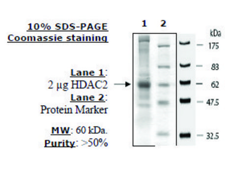 Human HDAC2, GenBank Accession No. Q92769, full length with C-terminal DDDDK tag (FLAG), MW = 60 kDa, expressed in baculovirus expression system.