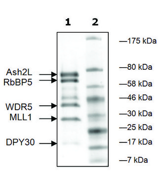 MLL1/WARD complex of human MLL1 (GenBank Accession No. NM_005933) amino acids 3745-end with N-terminal His-tag, MW= 27 kDa, human WDR5 (GenBank Accession No. NM_017588), amino acids 22-end with N-terminal Flagtag, MW= 35 kDa, human Ash2L (GenBank Accession No. NM_001105214), amino acids 2-end with N-terminal His-tag, MW= 61 kDa, human RbBP5 (GenBank Accession No. NM_005057), amino acids 2-end with N-terminal His-tag, MW= 60 kDa, and human DPY30 (GenBank Accession No. NM_032574), amino acids 2-end with N-terminal His-tag, MW=12 kDa, individually expressed in an E. coli expression system.