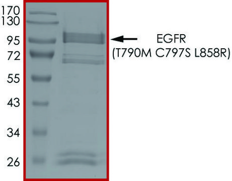 Recombinant human EGFR (T790M C797S L858R) (668-end) was expressed by Baculovirus in Sf9 insect cells using an N-terminal GST tag. EGFR is the receptor for members of the EGF family and is a transmembrane glycoprotein that has tyrosine kinase activity. Binding of epidermal growth factor to EGFR induces receptor dimerization and tyrosine autophosphorylation and leads to cell proliferation, differentiation, motility, and cell survival (1). Activation of EGFR triggers mitogenic signaling in gastrointestinal mucosa, and its expression is upregulated in colon cancers and most neoplasms (2). Activation of EGFR triggers activation of the ERK-signaling pathway in normal gastric epithelial and colon cancer cell lines. Inactivation of EGFR with selective inhibitors significantly reduces ERK2 activation, c-fos mRNA expression and cell proliferation.