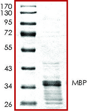 MBP 或髓鞘碱性蛋白在髓磷脂形成过程中形成跨胞质的二聚体。涉及折叠、聚合和底物特异性的蛋白质区域在各种物种中均是保守的,并且在髓磷脂膜中的蛋白质-脂质相互作用中可能具有特殊作用。MBP 是多种蛋白激酶的有效底物,与 MARCKS 蛋白具有相似性,均具有受其环境调控的扩展构象、N 末端修饰,与脂质相互作用的双重性质以及与肌动蛋白和 Ca2+-钙调蛋白的结合。髓鞘碱性蛋白(MBP)预期在 MS(多发性硬化症)等脱髓鞘疾病中发挥重要作用。