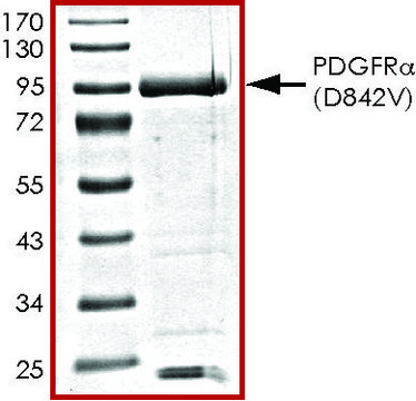 PDGFR alpha (platelet-derived growth factor receptor a) is a member of the PDGFR family of membrane receptors with intrinsic tyrosine kinase activity. Aberrant expression of PDGFR alpha has been linked to developmental abnormalities in vertebrate models and has been implicated in multiple disease states in humans. There is widespread expression of PDGFR alpha in renal cell types involved in fibrotic and sclerosing processes. PDGF and its receptor PDGFR alpha are inducers of fibrosis in the repair phase of inflammatory bowel disease and they may also be involved in the active inflammatory phase. PDGFRa(D842V) is one of the mutant forms of PDGFRa.