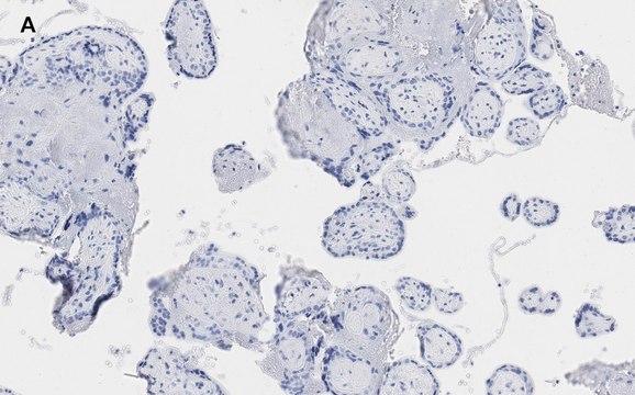 免疫组织化学(石蜡)分析:代表性批次的1:1000稀释液在人胎盘和小鼠胎盘组织切片中检测到BCRP (ABCG2)。