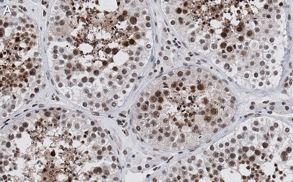 Immunohistochemistry (Paraffin) Analysis: A 1:100 dilution from a representative lot detected BRCA1 in human testis tissue sections.