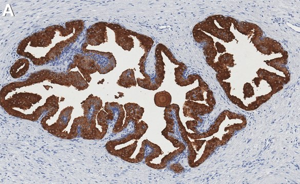 Immunohistochemistry (Paraffin) Analysis: A 1:1,000 dilution from a representative lot detected prostate specific antigen (PSA) in human prostate tissue sections.