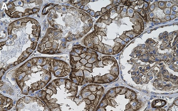 Immunohistochemistry (Paraffin) Analysis: A 1:100 dilution from a representative lot detected Spectrin in Human kidney tissue sections.