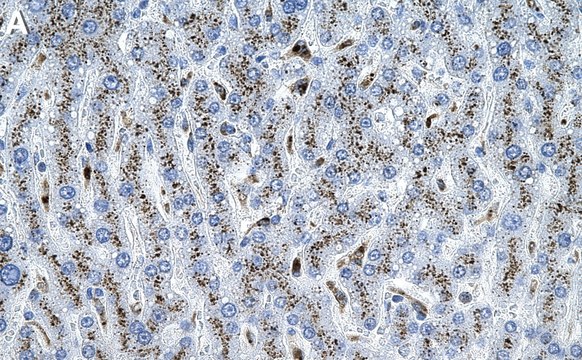 Immunohistochemistry (Paraffin) Analysis: A 1:1,000 dilution from a representative lot detected β Galactosidase in human liver tissue sections.