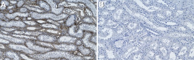 Immunohistochemistry (Paraffin) Analysis: A 1:100 dilution from a representative lot detected Collagen IV 2 in Human kidney tissue sections.