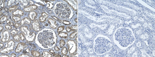 Immunohistochemistry (Paraffin) Analysis: A 1:1,000 dilution from a representative lot detected PKA C- in Human kidney tissue sections.