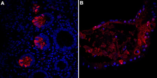 Immunofluorescence Analysis: A 1:100 dilution from a representative lot detected Lysozyme C in human colon and human iPSC-derived colon organoid sections.
