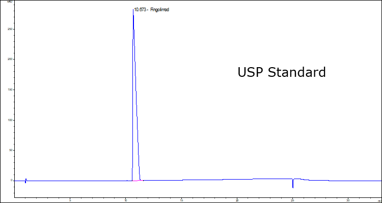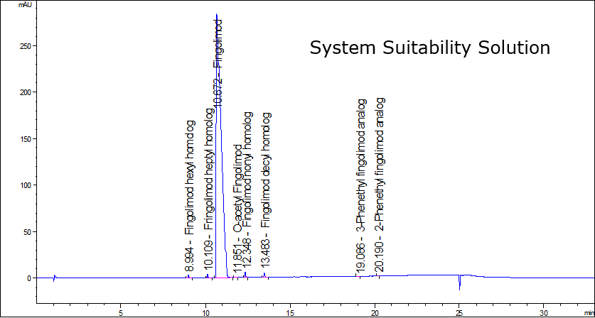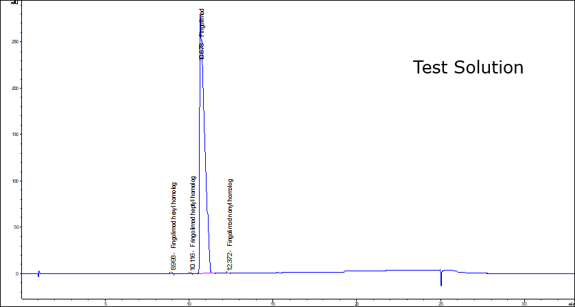 A rapid, accurate, and simple method was implemented for the total chromatographic purity analysis of Fingolimod Hydrochloride by High Performance Liquid Chromatography equipped with a Diode Array Detector. The experimental conditions follow guidelines, with minor allowed modifications, from the USP43-NF38 monograph methods for Fingolimod Hydrochloride Assay and Organic Impurities Profiling. Fingolimod hexyl homolog, Fingolimod heptyl homolog, Fingolimod Hydrochloride, Fingolimod nonyl homolog, Fingolimod decyl homolog, 3-Phenethyl Fingolimod analog, and 2-Phenethyl Fingolimod analog can be resolved with baseline separation utilizing the USP‘s 33-minute gradient method and a Purospher STAR RP-18 HPLC column (150 x 3.0 mm, 3 μm). A 0.1% solution of Phosphoric acid in water and acetonitrile were employed as the mobile phases for the gradient elution. Under applied conditions, system suitability criteria are met, and the method demonstrates good resolution/selectivity, reproducibility, and sensitivity.