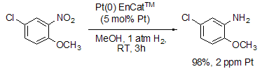 Pt(0) EnCat™ 40 is a versatile hydrogenation catalyst demonstrating high chemoselectivity and improved safety profile over platinum on carbon allowing easier, faster and cleaner processes to be developed. Isolating the active platinum within the polymer matrix has produced an easily-handled and safer alternative to Pt/C. The catalyst is particularly effective for hydrogenation of nitro groups and reductive aminations in the presence of halogens.