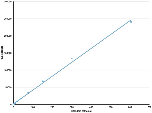 Dispersion of the Donor Particle in isopropanol disrupts the particle core releasing unquenched fluorescent substrate. A serial dilution of the dispersed Donor Particle was added to a microplate and read at excitation 465 nm / emission 535 nm and the fluorescence was plotted as a function of substrate concentration in pmoles/well. The linear relationship between fluorescence and pmoles of substrate in this standard provides a quantitative output for assay results.