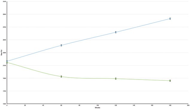 Raw fluorescence (+/- SEM) from a time course with 2.5 μl plasma sample and buffer blank incubated at 25 ℃ for 20 minutes, read at 4 minute time points.