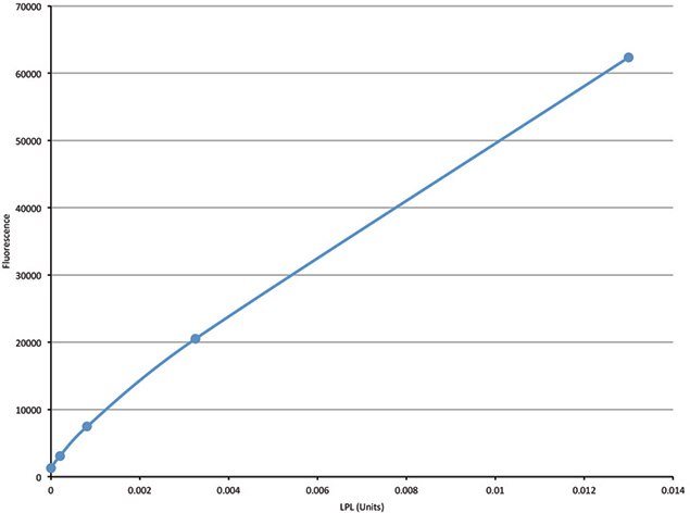 The LPL Activity Assay Kit (Product No. #MAK109) includes Substrate Emulsion and Standard to quantitate moles of substrate hydrolyzed. The non-fluorescent Substrate Emulsion becomes fluorescent once hydrolyzed and the fluorescence intensity units are converted to pmoles by linear regression using serially diluted Standard, which contains pre-hydrolyzed substrate.