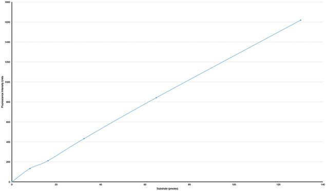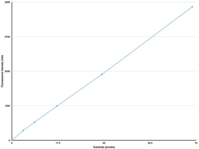 Dispersion of the Donor Particle in isopropanol disrupts the particle releasing unquenched fluorescent substrate. A serial dilution of the dispersed Donor Particle was added to a microplate and excited at 465 nm. The fluorescence intensity was measured at 535 nm and plotted as a function of substrate concentration in pmoles/well. Raw fluorescence from activity assays are converted to fluorescence transferred by subtracting the fluorescence of the assay Buffer Blank. Picomoles transferred may be calculated by linear regression using the standard curve.