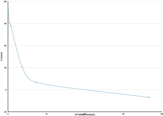 Assays were set up in a microplate with premixed components consisting of 2 μl Donor Particle, 2 μl Acceptor Particle, 80 μl of Assay Buffer at 0.1% BSA with increasing concentrations of CP-346086 from 0.11 to 55 nM in DMSO. Purified MTP 5 μl was added and the plate was incubated for 60 minutes at 37 ℃. Fluorescence was measured at excitation 465 nm and emission at 535 nm. The percent control was plotted against CP-346086 concentration with an IC50 of 4 nM.
