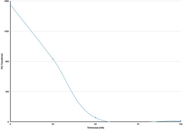 Plasma was diluted 1:10 with Assay Buffer and incubated with thimerosal at concentrations from 100 to 25 mM at 25 ℃ for 30 minutes. Assays were set up at each thimerosal concentration containing 15 μl of preincubated plasma and then incubated at 30 ℃ for 30 minutes. Fluorescence was measured at excitation 465 nm and emission at 535 nm. Fluorescence transferred was plotted versus thimerosal concentration.