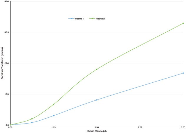 Assays were prepared according to the Protocol (4 μl Donor Particle, 4 μl Acceptor Particle, 182 μl Assay Buffer and 10 μl of 1:5 diluted plasma) and incubated at 37 ℃ for 180 minutes. Fluorescence was measured at excitation 465 nm and emission at 535 nm. Fluorescence transferred was calculated by subtracting the fluorescence of the Buffer Blanks from plasma samples. Picomoles of substrate transferred was determined using the standard curve. The assay is linear with up to 2 μl of plasma.
