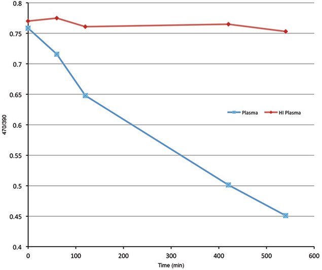 Assays containing 4 μl of fresh or heat inactivated (HI) plasma, 1 μl of Substrate Reagent and 95 μl of Assay Buffer were incubated at 37 ℃. At each time point, 200 μl Read Reagent was added and 200 μl of the mixture was transferred to a microplate. The fluorescence of the plate was read at excitation 325 nm and emission 470 nm and 390 nm. The ratio of intensities 470/390 was plotted against time.